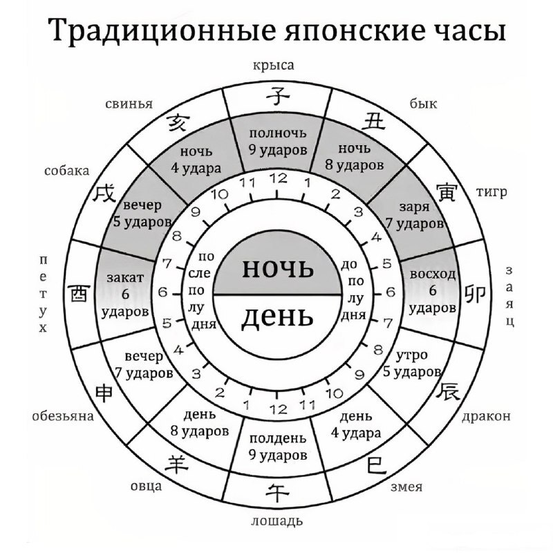 Час Крысы — это первый час в сутках, около полуночи. Час Кролика наступает примерно с восходом солнца. В час Лошади солнце в зените, около полудня. Час Собаки — на закате, когда начинает смеркаться.
