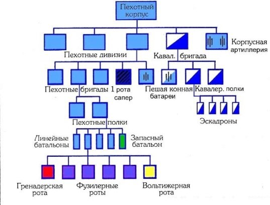 Пехотные полки коронной армии состояли из двух батальонов по четыре роты в каждом. Гренадерская рота была распределена по пехотным ротам: